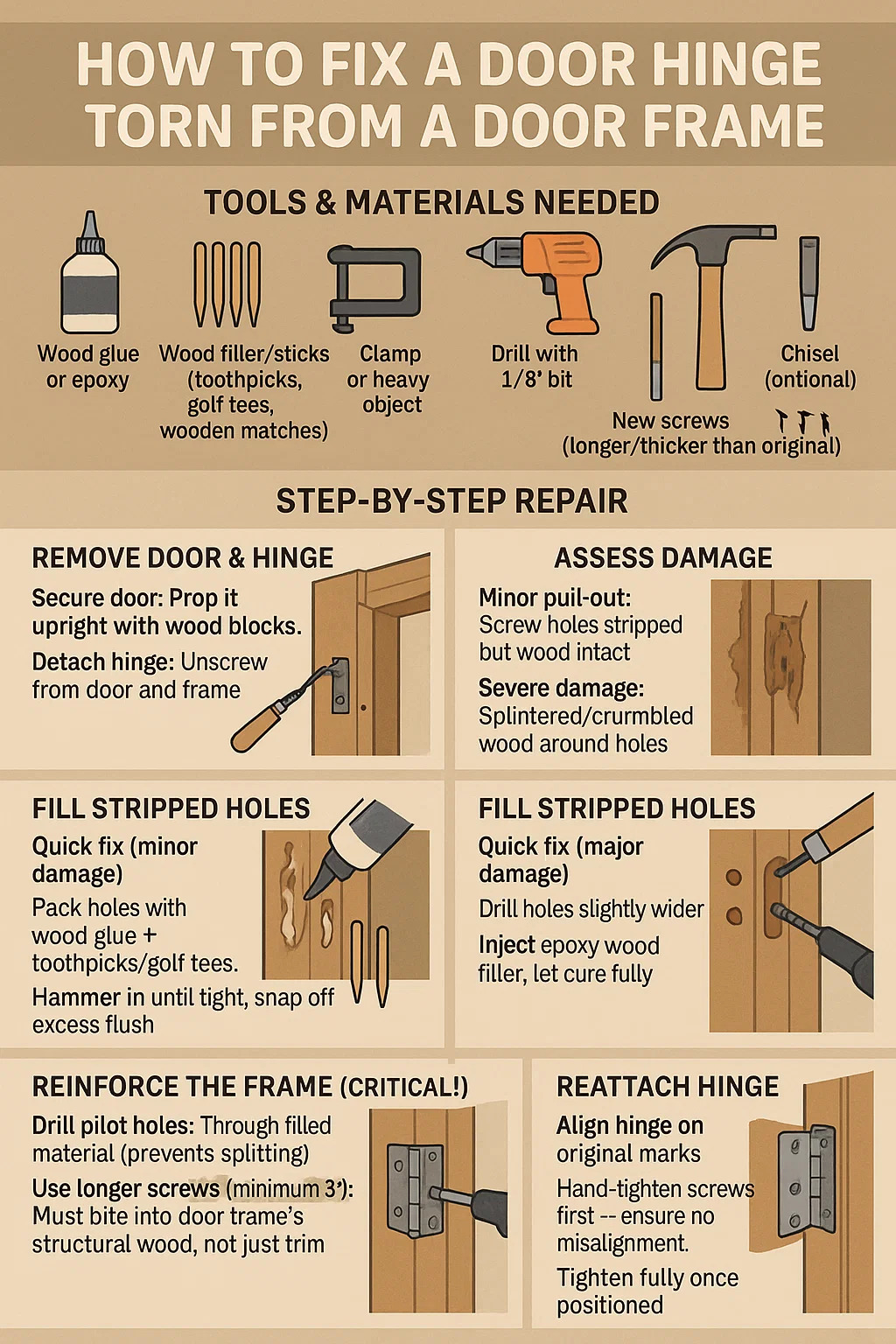 Inilah cara untuk menetapkan a engsel pintu Dikeluarkan dari bingkai pintu, langkah demi langkah: