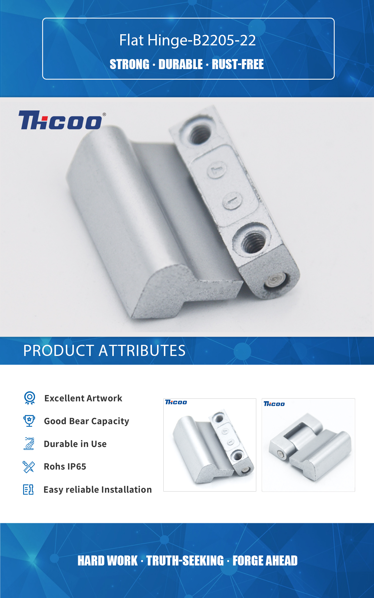 Kami mempunyai makmal ujian kami sendiri dan peralatan pemeriksaan yang canggih dan lengkap, yang boleh memastikan kualiti produk. Engsel Rata-B2205-22 ialah engsel rata aloi zink. Terdapat beberapa ciri yang mungkin dikaitkan dengan engsel rata aloi zink, termasuk : Rintangan kakisan: Aloi zink tahan kakisan, yang menjadikan engsel ini sesuai digunakan dalam persekitaran luar atau menghakis. Kekuatan: Aloi zink ialah bahan yang kuat dan tahan lama, yang menjadikan engsel ini sesuai untuk digunakan dalam aplikasi tugas berat.
