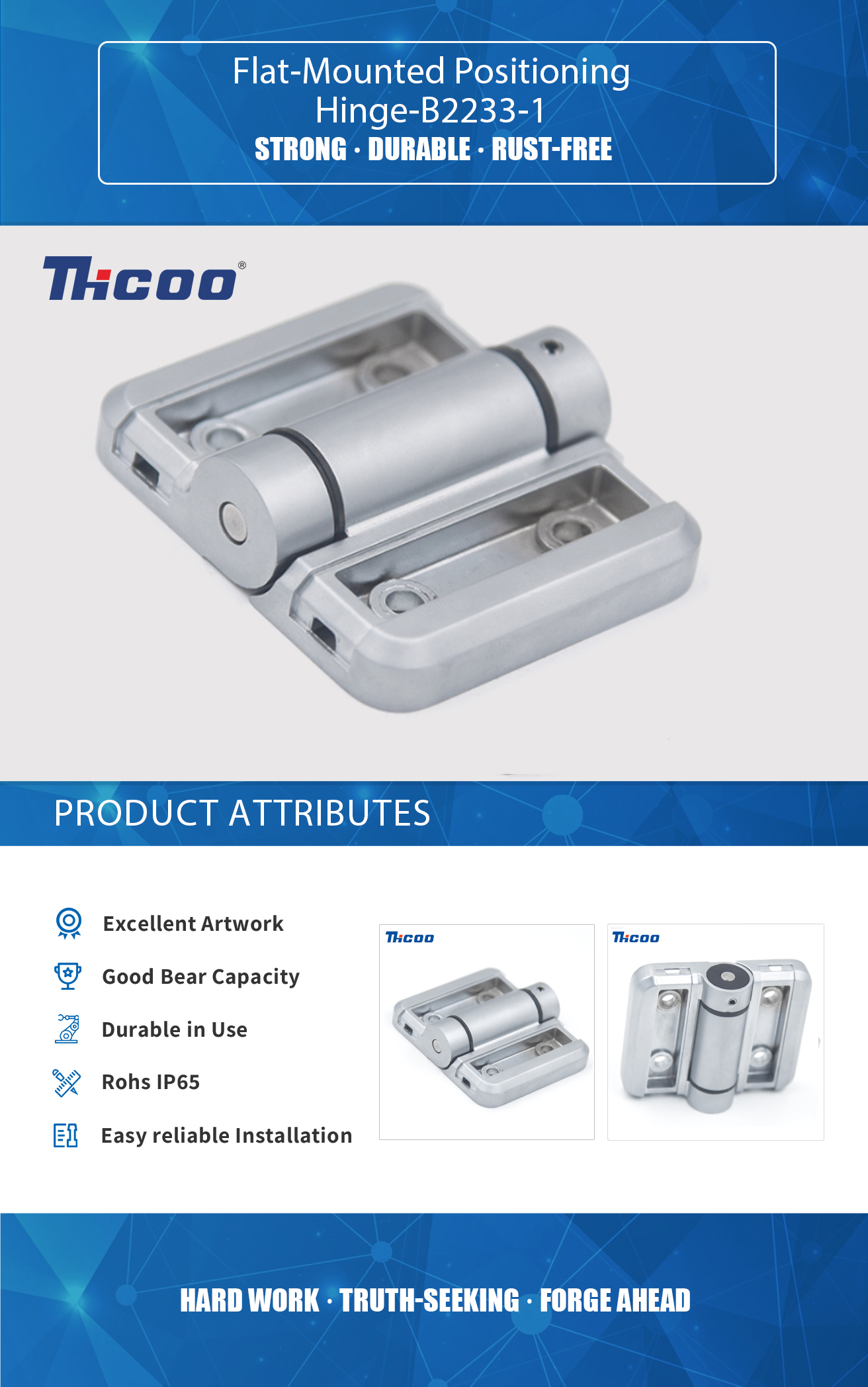 Kami mempunyai makmal ujian kami sendiri dan peralatan pemeriksaan yang canggih dan lengkap, yang boleh memastikan kualiti produk. Engsel Kedudukan Dipasang Rata-B2233-1  adalah sejenis engsel yang direka bentuk untuk menahan pintu, tingkap atau panel alih lain dalam kedudukan tertentu apabila ia tidak digunakan. Engsel ini biasanya dipasang pada permukaan panel, bukannya pada tepi.