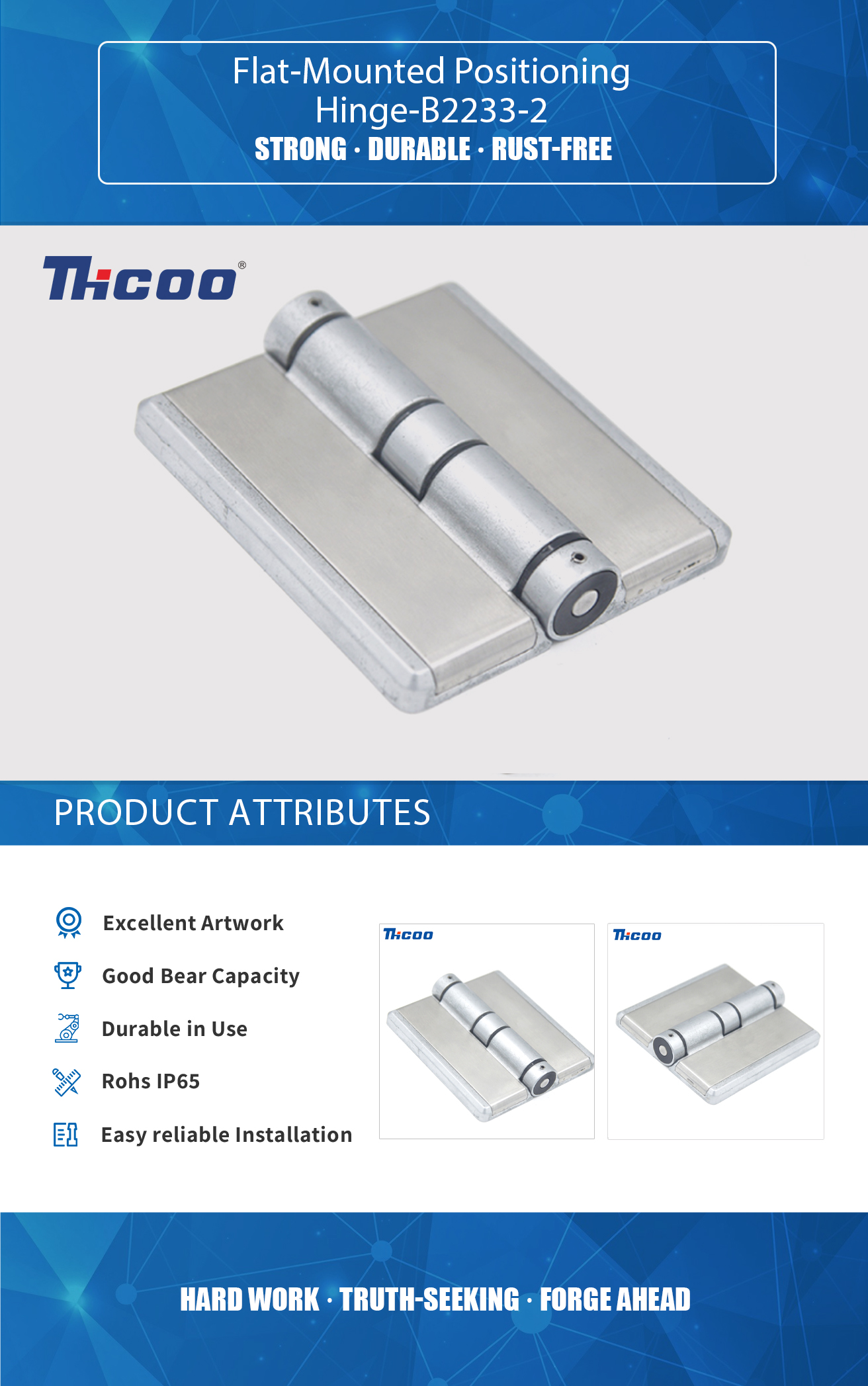 Kami mempunyai makmal ujian kami sendiri dan peralatan pemeriksaan yang canggih dan lengkap, yang boleh memastikan kualiti produk. Engsel Kedudukan Dipasang Rata-B2233-2 digunakan dalam pelbagai aplikasi yang mana penting untuk memegang pintu, tingkap atau panel lain pada kedudukan tertentu apabila ia tidak digunakan. Peranti tahan buka pintu: Engsel ini adalah selalunya digunakan untuk menahan pintu terbuka pada sudut tertentu, membolehkan laluan mudah melalui ambang pintu.